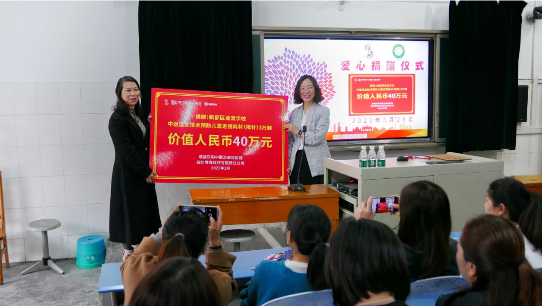 活動最后,舉行了愛心捐贈儀式。唯高集團(tuán)向?qū)W校捐贈了價值40萬元的預(yù)防兒童近視中醫(yī)技術(shù)耗材撳針,共計3萬顆。全方位助力學(xué)校開展近視防控工作,充分發(fā)揮中醫(yī)藥改革試驗基地的優(yōu)勢,服務(wù)于轄區(qū)內(nèi)的兒童眼健康。會上,學(xué)校黨支部書記、校長劉元紅接收了唯高集團(tuán)副總經(jīng)理朱蕓女士交予的捐贈牌。劉校長代表學(xué)校向唯高集團(tuán)表示感謝,朱蕓女士表示希望通過開展這樣有意義的活動,帶動更多的家長和學(xué)生重視近視預(yù)防,也期待未來孩子們都有更加明亮的眼睛。